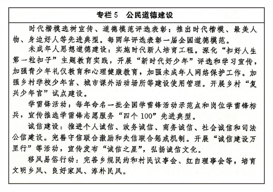 傳承弘揚(yáng)中華傳統(tǒng)美德,加強(qiáng)社會(huì)公德、職業(yè)道德、家庭美德、個(gè)人品德建設(shè),加強(qiáng)家庭、家教、家風(fēng)建設(shè)。加強(qiáng)對(duì)革命、建設(shè)、改革時(shí)期各類先進(jìn)典型的學(xué)習(xí)宣傳,尊崇褒揚(yáng)英雄模范,關(guān)心關(guān)愛先進(jìn)典型人物。健全家庭、學(xué)校、政府、社會(huì)相結(jié)合的思想道德教育體系,把立德樹人貫穿學(xué)校教育全過程。發(fā)揮優(yōu)秀文化產(chǎn)品陶冶道德情操的作用,完善市民公約、鄉(xiāng)規(guī)民約、學(xué)生守則、團(tuán)體章程等社會(huì)規(guī)范,廣泛開展弘揚(yáng)時(shí)代新風(fēng)行動(dòng),深化道德領(lǐng)域突出問題治理。加強(qiáng)農(nóng)村思想道德建設(shè),創(chuàng)新文化科技衛(wèi)生“三下鄉(xiāng)”長效機(jī)制。
