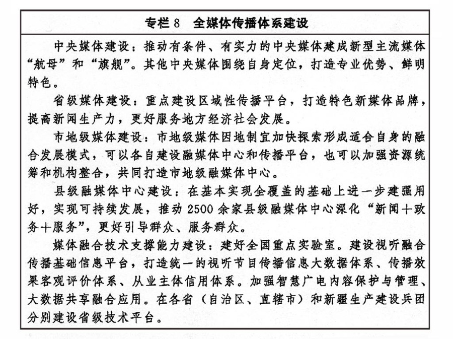 加快推進(jìn)媒體深度融合發(fā)展,有效整合各種媒介資源、生產(chǎn)要素,推動(dòng)在信息內(nèi)容、技術(shù)應(yīng)用、平臺(tái)終端、管理手段等方面共融互通,打造一批具有強(qiáng)大影響力、競(jìng)爭(zhēng)力的新型主流媒體。統(tǒng)籌處理好傳統(tǒng)媒體和新興媒體、中央媒體和地方媒體、主流媒體和商業(yè)平臺(tái)、大眾化媒體和專業(yè)性媒體的關(guān)系,建立以內(nèi)容建設(shè)為根本、先進(jìn)技術(shù)為支撐、創(chuàng)新管理為保障的全媒體傳播體系。推進(jìn)內(nèi)容生產(chǎn)供給側(cè)結(jié)構(gòu)性改革,完善高質(zhì)量?jī)?nèi)容產(chǎn)出機(jī)制,推廣互動(dòng)式、服務(wù)式、場(chǎng)景式傳播。強(qiáng)化新一代信息技術(shù)支撐引領(lǐng)作用,支持主流媒體重塑采編流程、建設(shè)平臺(tái)終端、優(yōu)化管理手段、強(qiáng)化版權(quán)保護(hù)、打造媒體資源數(shù)據(jù)庫、提升內(nèi)容生產(chǎn)力、占據(jù)傳播制高點(diǎn)。創(chuàng)新媒體業(yè)態(tài)、傳播方式和運(yùn)營模式,強(qiáng)化用戶連接,發(fā)揮制度優(yōu)勢(shì)和市場(chǎng)作用,增強(qiáng)主流媒體競(jìng)爭(zhēng)力。