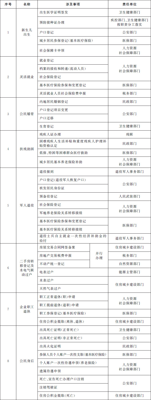 (二)推進(jìn)個(gè)人全生命周期相關(guān)政務(wù)服務(wù)事項(xiàng)“一件事一次辦”。圍繞個(gè)人從出生到身后全生命周期的重要階段,梳理集成同一階段內(nèi)需要辦理的多個(gè)單一政務(wù)服務(wù)事項(xiàng),為群眾提供新生兒出生、入園入學(xué)、大中專學(xué)生畢業(yè)、就業(yè)、就醫(yī)、婚育、扶殘助困、軍人退役、二手房交易及水電氣聯(lián)動過戶、退休、身后等集成化辦理服務(wù),切實(shí)提升群眾辦事便捷度,減少跑動次數(shù)。