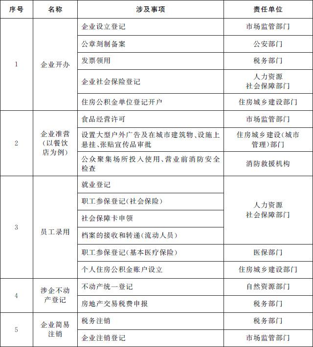 (一)推進(jìn)企業(yè)全生命周期相關(guān)政務(wù)服務(wù)事項(xiàng)“一件事一次辦”。圍繞企業(yè)從開辦到注銷全生命周期的重要階段,梳理集成同一階段內(nèi)需要到政府部門、公用企事業(yè)單位和服務(wù)機(jī)構(gòu)辦理的多個(gè)單一政務(wù)服務(wù)事項(xiàng),為企業(yè)提供開辦、工程建設(shè)、生產(chǎn)經(jīng)營、惠企政策兌現(xiàn)、員工錄用、不動產(chǎn)登記、注銷等集成化辦理服務(wù),提高辦事效率,降低辦事成本。