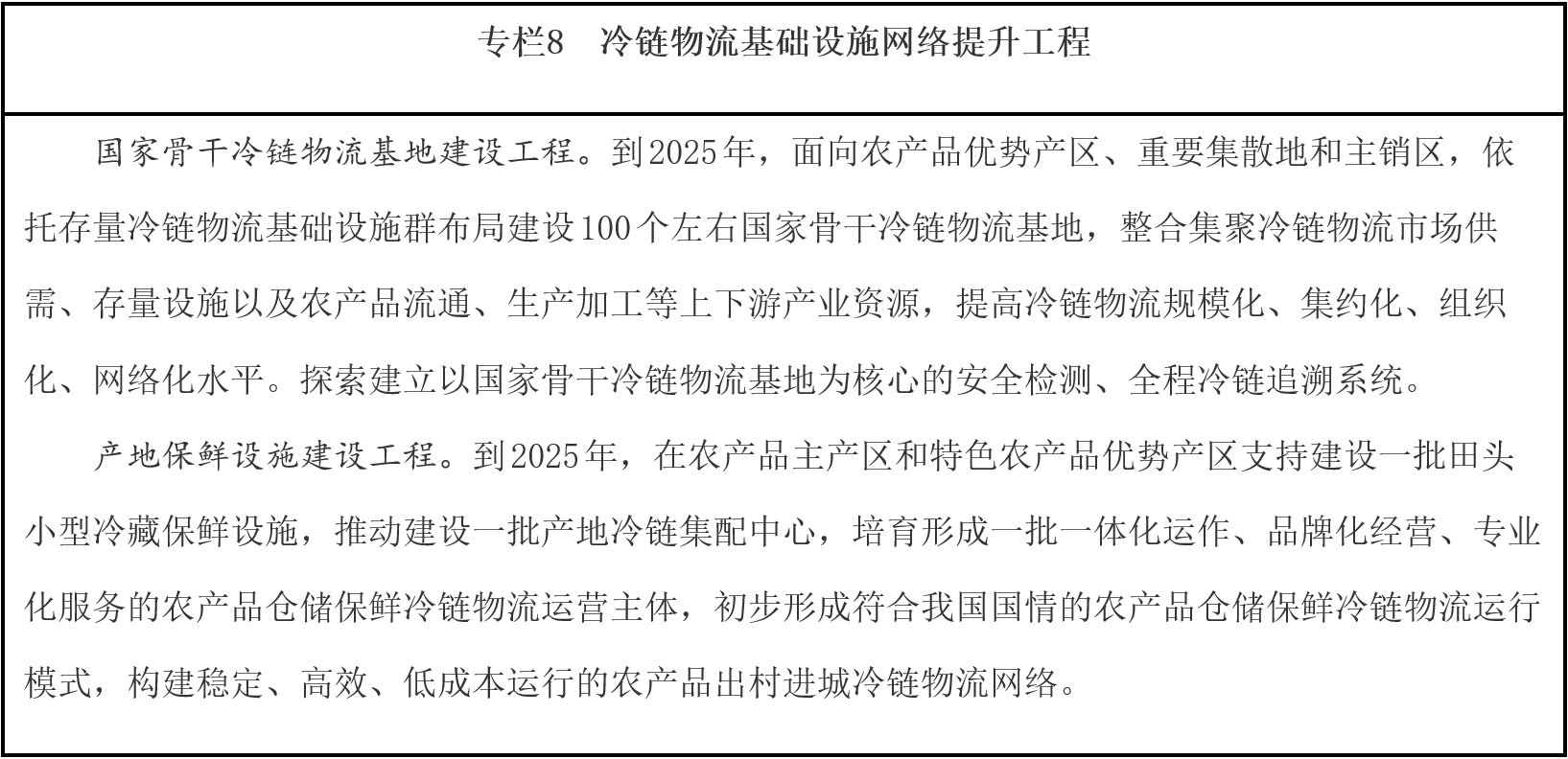 提高冷鏈物流質(zhì)量效率。大力發(fā)展鐵路冷鏈運(yùn)輸和集裝箱公鐵水聯(lián)運(yùn),對接主要農(nóng)產(chǎn)品產(chǎn)區(qū)和集散地,創(chuàng)新冷鏈物流干支銜接模式。發(fā)展“生鮮電商+產(chǎn)地直發(fā)”等冷鏈物流新業(yè)態(tài)新模式。推廣蓄冷箱、保溫箱等單元化冷鏈載器具和標(biāo)準(zhǔn)化冷藏車,促進(jìn)冷鏈物流信息互聯(lián)互通,提高冷鏈物流規(guī)?;?、標(biāo)準(zhǔn)化水平。依托國家骨干冷鏈物流基地、產(chǎn)銷冷鏈集配中心等大型冷鏈物流設(shè)施,加強(qiáng)生鮮農(nóng)產(chǎn)品檢驗(yàn)檢疫、農(nóng)獸藥殘留及防腐劑、保鮮劑、添加劑合規(guī)使用等質(zhì)量監(jiān)管。研究推廣應(yīng)用冷鏈道路運(yùn)輸電子運(yùn)單,加強(qiáng)產(chǎn)品溯源和全程溫濕度監(jiān)控,將源頭至終端的冷鏈物流全鏈條納入監(jiān)管范圍,提升冷鏈物流質(zhì)量保障水平。健全進(jìn)口冷鏈?zhǔn)称窓z驗(yàn)檢疫制度,筑牢疫情外防輸入防線。