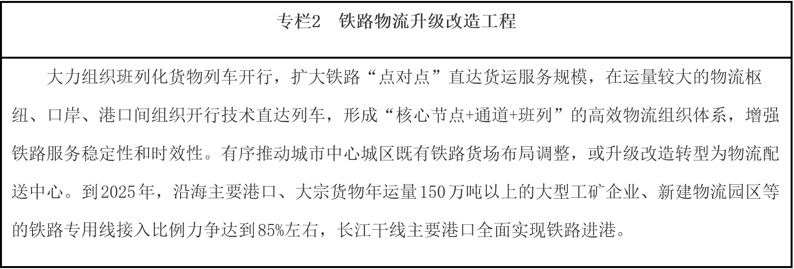 推進(jìn)結(jié)構(gòu)性降成本。加快推進(jìn)鐵路專用線進(jìn)港區(qū)、連園區(qū)、接廠區(qū),合理有序推進(jìn)大宗商品等中長距離運(yùn)輸“公轉(zhuǎn)鐵”、“公轉(zhuǎn)水”。完善集裝箱公鐵聯(lián)運(yùn)銜接設(shè)施,鼓勵發(fā)展集拼集運(yùn)、模塊化運(yùn)輸、“散改集”等組織模式,發(fā)揮鐵路干線運(yùn)輸成本低和公路網(wǎng)絡(luò)靈活優(yōu)勢,培育有競爭力的“門到門”公鐵聯(lián)運(yùn)服務(wù)模式,降低公鐵聯(lián)運(yùn)全程物流成本。統(tǒng)籌沿海港口綜合利用,提升大型港口基礎(chǔ)設(shè)施服務(wù)能力,提高碼頭現(xiàn)代化專業(yè)化規(guī)?;剑涌焱七M(jìn)鐵水聯(lián)運(yùn)銜接場站改造,提高港口鐵路專用線集疏網(wǎng)絡(luò)效能,優(yōu)化作業(yè)流程。完善內(nèi)河水運(yùn)網(wǎng)絡(luò),統(tǒng)籌江海直達(dá)、江海聯(lián)運(yùn)發(fā)展,發(fā)揮近海航線、長江水道、珠江水道等水運(yùn)效能,穩(wěn)步推進(jìn)貨物運(yùn)輸“公轉(zhuǎn)水”。推進(jìn)鐵水聯(lián)運(yùn)業(yè)務(wù)單證電子化,促進(jìn)鐵路、港口信息互聯(lián),實(shí)現(xiàn)鐵路現(xiàn)車、裝卸車、貨物在途、到達(dá)預(yù)確報以及港口裝卸、貨物堆存、船舶進(jìn)出港、船期艙位預(yù)定等鐵水聯(lián)運(yùn)信息交換共享。支持港口、鐵路場站加快完善集疏運(yùn)油氣管網(wǎng),有效對接石化等產(chǎn)業(yè)布局,提高管道運(yùn)輸比例。