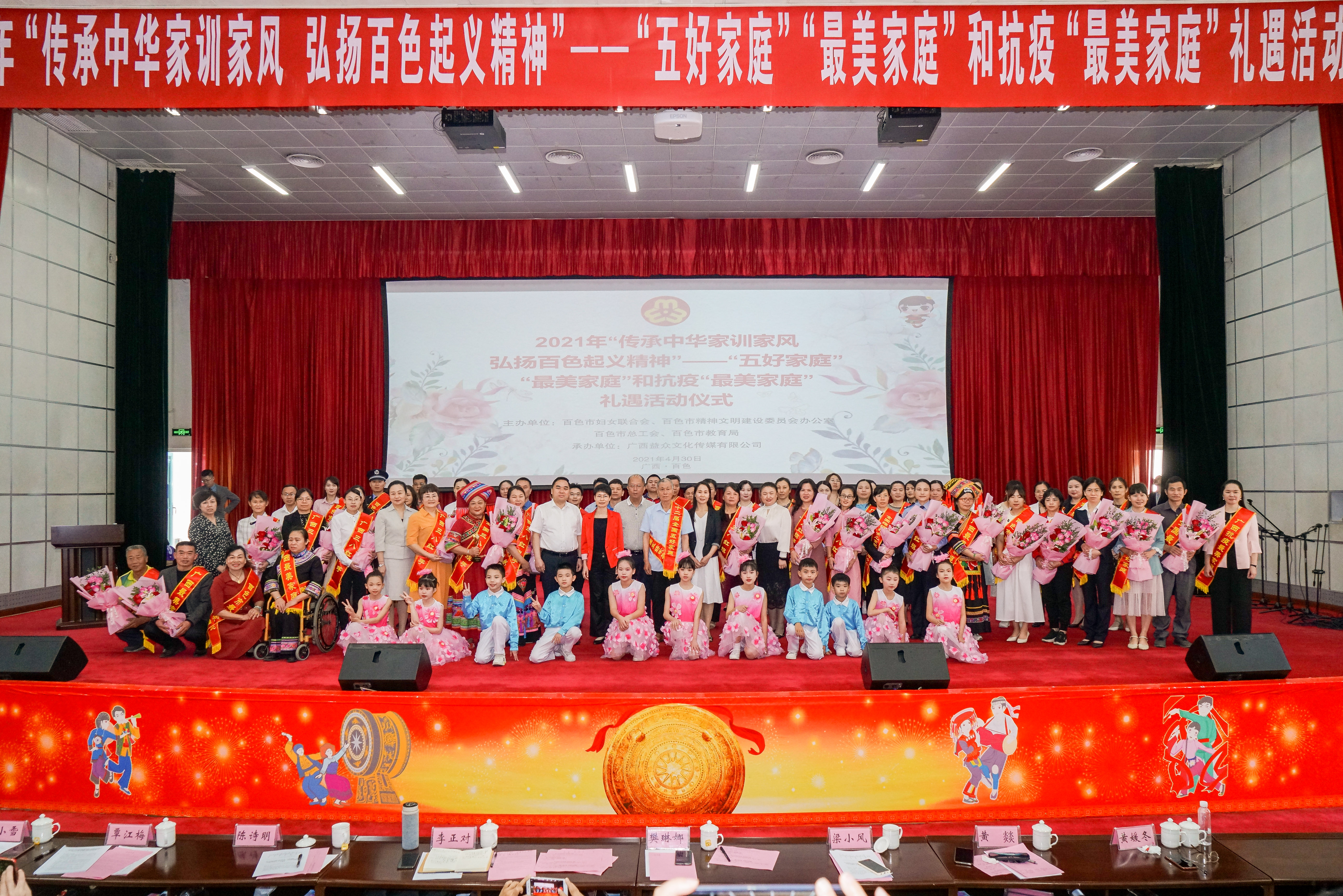 ????????為弘揚(yáng)中華民族家庭美德、樹立良好家風(fēng)、激勵(lì)抗疫精神,落實(shí)全國(guó)婦聯(lián)、自治區(qū)婦聯(lián)關(guān)于開展尋找“最美家庭”活動(dòng)精神。4月30日,由百色市婦聯(lián)、市文明辦、市總工會(huì)、市教育局聯(lián)合舉辦,廣西益眾文化傳媒有限公司承辦的2021年“傳承中華家訓(xùn)家風(fēng)?弘揚(yáng)百色起義精神”——“五好家庭”“最美家庭”和抗疫“最美家庭”禮遇活動(dòng)儀式在右江區(qū)禮堂舉行。來自2020年“五好家庭”“最美家庭”和抗疫“最美家庭”代表、“最美家庭”禮遇愛心單位代表以及百色市市直機(jī)關(guān)、企事業(yè)單位和社會(huì)各界代表等共計(jì)200多人參加活動(dòng)。
