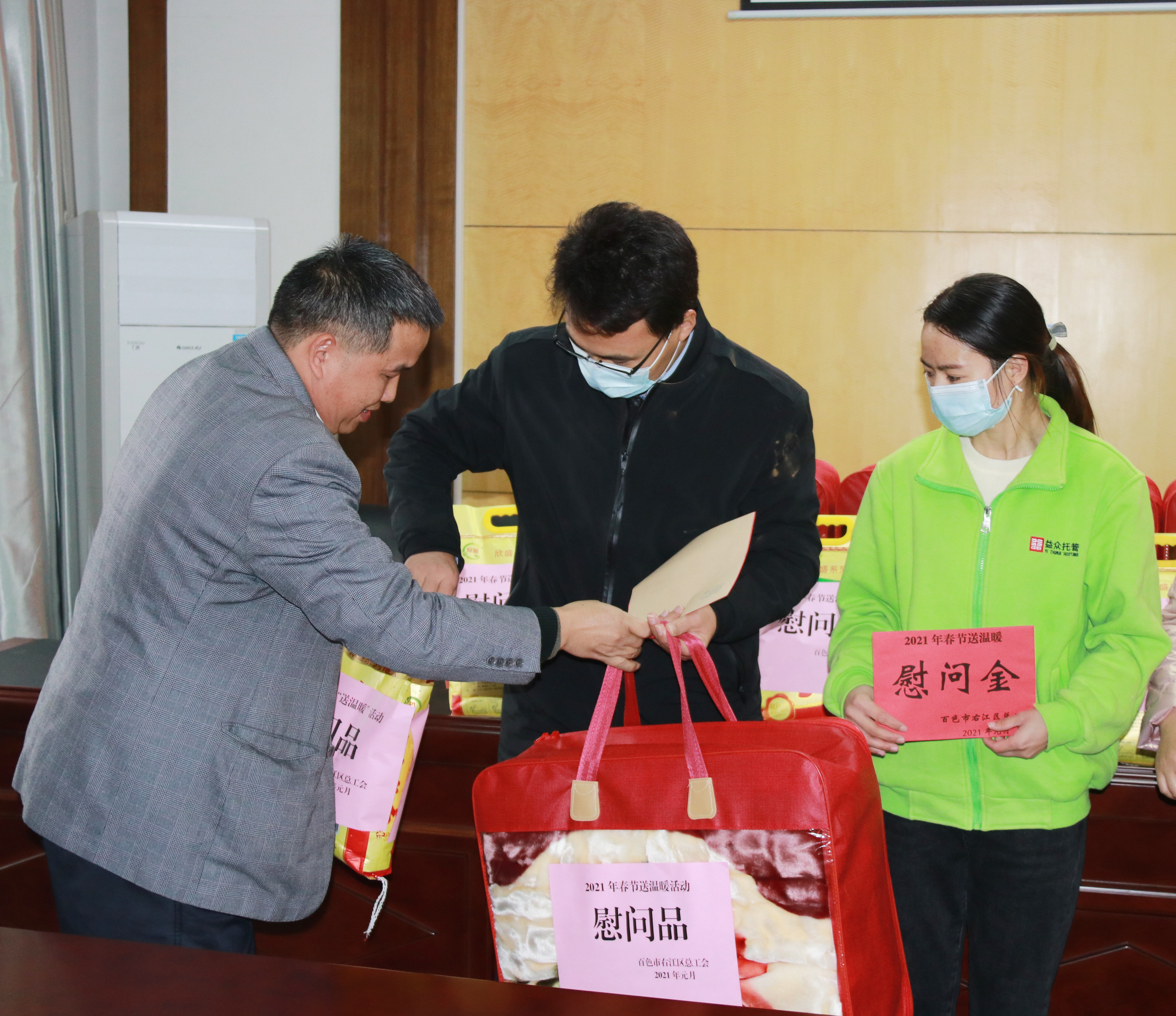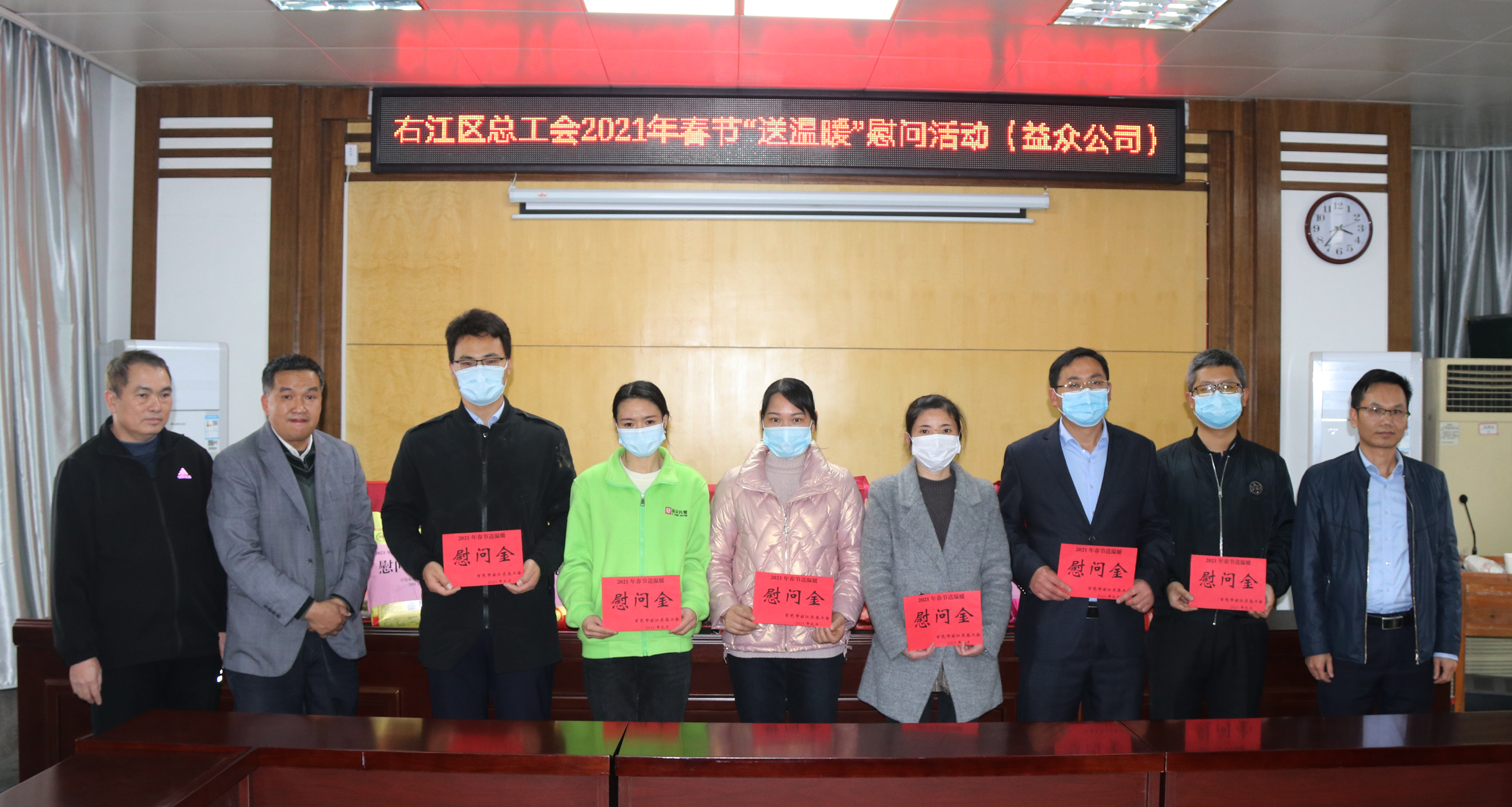 ????????1月26日下午,百色市右江區(qū)總工會黨組成員、副主席黃有路一行到益眾公司慰問廣西區(qū)外職工春節(jié)留右職工代表,把黨委政府的關(guān)懷和工會組織的溫暖及時送到職工的心坎上。