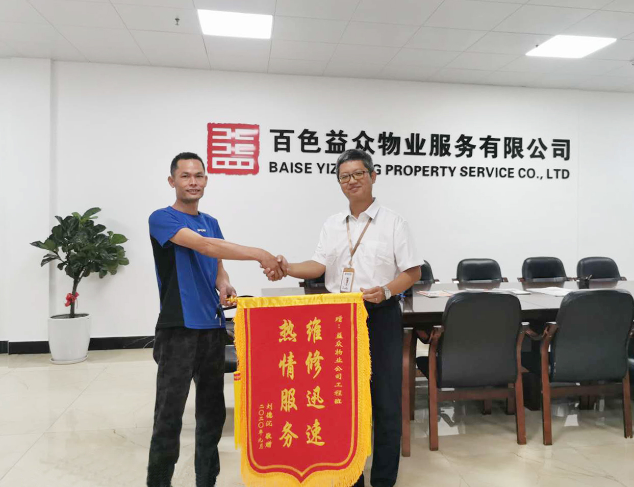 ????????近日,右江區(qū)“老鄉(xiāng)家園-迎龍易地扶貧搬遷安置小鎮(zhèn)”4棟101商鋪的黃先生將一面“熱情服務 維修迅速”的錦旗送到益眾物業(yè)服務中心。