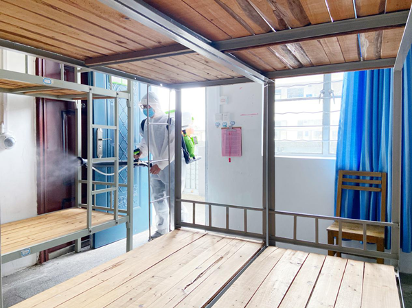 醫(yī)務(wù)人員對(duì)各宿舍進(jìn)行消毒