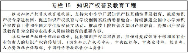 提升知識產(chǎn)權(quán)人才能力水平。完善知識產(chǎn)權(quán)人才分類培訓(xùn)體系,健全人才保障機制。加強知識產(chǎn)權(quán)理論研究,完善知識產(chǎn)權(quán)研究管理機制,強化智庫建設(shè),鼓勵地方開展政策研究。加強知識產(chǎn)權(quán)行政管理、行政執(zhí)法、行政裁決人員培養(yǎng),分層次分區(qū)域持續(xù)開展輪訓(xùn)。加強企事業(yè)單位知識產(chǎn)權(quán)人才培養(yǎng),建設(shè)理論與實務(wù)聯(lián)訓(xùn)基地。建立知識產(chǎn)權(quán)服務(wù)業(yè)人才培訓(xùn)體系,提高服務(wù)業(yè)人才專業(yè)能力。大力培養(yǎng)知識產(chǎn)權(quán)國際化人才。(國家知識產(chǎn)權(quán)局牽頭,中央宣傳部、市場監(jiān)管總局等按職責(zé)分工負(fù)責(zé))