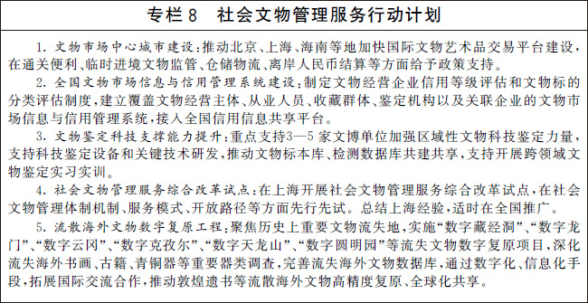 堅持社會效益優(yōu)先,加強對民間收藏的指導(dǎo)、管理和服務(wù),健全文物合法流通交易體制機制,優(yōu)化文物鑒定服務(wù)和文物進出境監(jiān)管,完善流失文物追索返還制度。