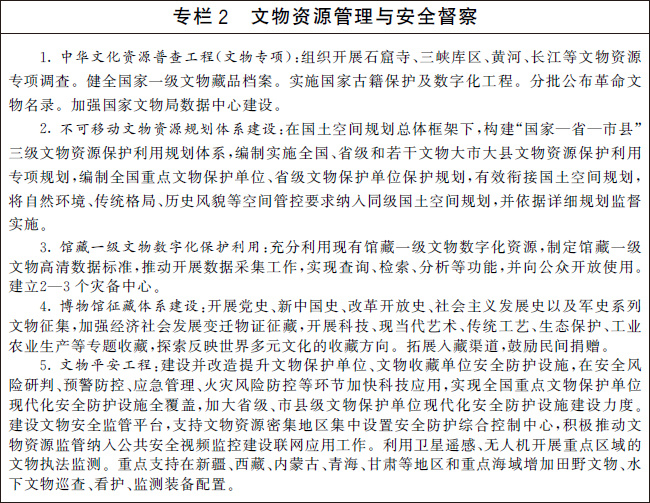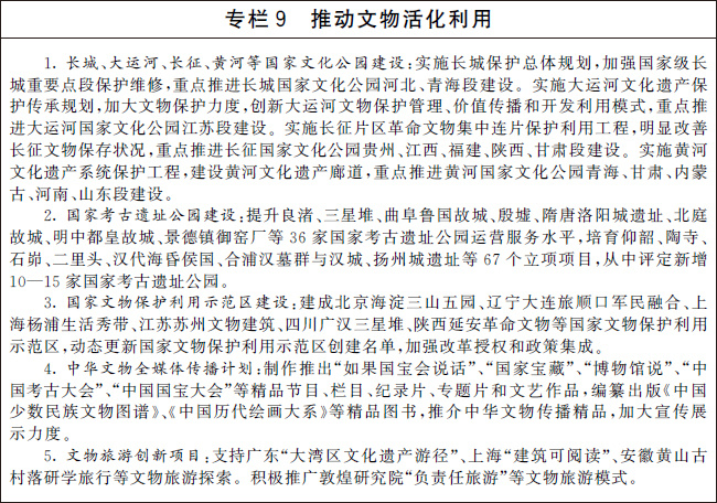 創(chuàng)新文物保護利用機制,加強文物和文化遺產(chǎn)保護利用,建設(shè)國家文物保護利用示范區(qū)。健全國有文物資源資產(chǎn)管理制度,推進文物資源資產(chǎn)管理信息共享,部署開展相關(guān)試點工作。完善各方主體參與文物保護利用的支持政策,保障利益相關(guān)方合法權(quán)益。探索創(chuàng)新對文物資源密集區(qū)的支持方式。建設(shè)文物領(lǐng)域國家智庫。
