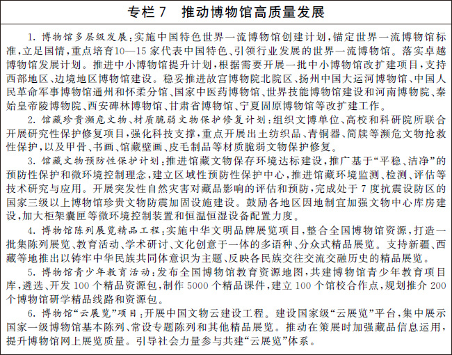 實施中國特色世界一流博物館創(chuàng)建計劃。支持省級、重要地市級博物館特色化發(fā)展。盤活基層博物館資源。探索建立行業(yè)博物館聯(lián)合認證、共建共管機制。規(guī)范和扶持非國有博物館發(fā)展,落實支持政策,依法依規(guī)推進非國有博物館法人財產(chǎn)權(quán)確權(quán)。認真履行相關(guān)審批程序,有序推動建設(shè)一批反映黨和國家建設(shè)成就的當(dāng)代主題博物館和行業(yè)博物館,重點支持建設(shè)反映中華文明發(fā)展歷程的國家級重點專題博物館,倡導(dǎo)建設(shè)特色專題博物館。探索在文化資源豐厚地區(qū)建設(shè)“博物館之城”。