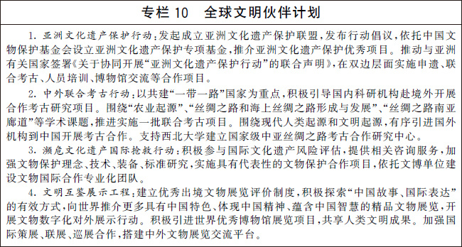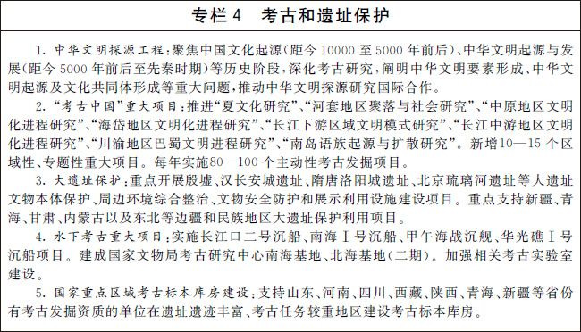 編制并實施“十四五”考古工作專項規(guī)劃。系統(tǒng)確定考古發(fā)掘重點,深化中華文明探源工程,推進“考古中國”重大項目,科學(xué)闡釋中國境內(nèi)人類起源、文明起源、中華文明形成、統(tǒng)一多民族國家建立和發(fā)展、中華文明在世界文明史中的重要地位等關(guān)鍵問題,揭示中華文明的歷史文化價值和核心特質(zhì)。
