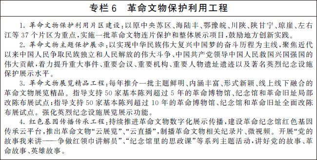 整合文物、黨史、軍史、檔案、地方志等方面研究力量,加強革命文物保護利用研究,開展實物、文獻、檔案、史料和口述史征集,挖掘革命文物深刻內(nèi)涵,推出重要研究成果,旗幟鮮明反對和抵制歷史虛無主義,繼續(xù)發(fā)揚偉大建黨精神,傳承弘揚井岡山精神、長征精神、遵義會議精神、延安精神、西柏坡精神、紅巖精神、抗美援朝精神、“兩彈一星”精神、特區(qū)精神、抗洪精神、抗震救災(zāi)精神、抗疫精神、脫貧攻堅精神等偉大精神。