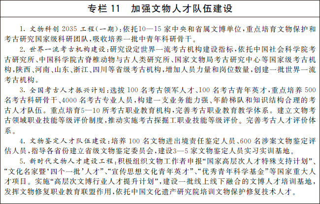 培育一批以領(lǐng)軍人才和中青年骨干創(chuàng)新人才為重點的高層次文物人才,加強考古、科技創(chuàng)新、文物鑒定、文物修復(fù)、文物展覽等急需領(lǐng)域人才培養(yǎng),加快建設(shè)一支門類齊全、技藝精湛的文物技能人才隊伍,穩(wěn)步造就一支科技研發(fā)能力和技術(shù)應(yīng)用能力過硬的文物科技人才隊伍,錘煉一支熟悉專業(yè)、素質(zhì)優(yōu)良的文物管理人才隊伍。加強相關(guān)行業(yè)文物保護人才培養(yǎng)。
