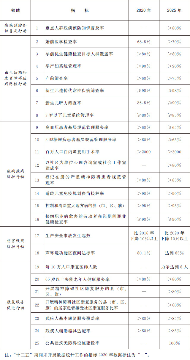 到2025年,覆蓋經(jīng)濟(jì)社會發(fā)展各領(lǐng)域的殘疾預(yù)防政策體系進(jìn)一步完善,全人群全生命周期殘疾預(yù)防服務(wù)網(wǎng)絡(luò)更加健全,全民殘疾預(yù)防素養(yǎng)明顯提升,遺傳和發(fā)育、疾病、傷害等主要致殘因素得到有效防控,殘疾康復(fù)服務(wù)狀況持續(xù)改善,殘疾預(yù)防主要指標(biāo)處于中高收入國家前列。