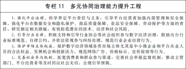 (三)完善多元共治新格局。建立完善政府、平臺(tái)、企業(yè)、行業(yè)組織和社會(huì)公眾多元參與、有效協(xié)同的數(shù)字經(jīng)濟(jì)治理新格局,形成治理合力,鼓勵(lì)良性競(jìng)爭(zhēng),維護(hù)公平有效市場(chǎng)。加快健全市場(chǎng)準(zhǔn)入制度、公平競(jìng)爭(zhēng)審查機(jī)制,完善數(shù)字經(jīng)濟(jì)公平競(jìng)爭(zhēng)監(jiān)管制度,預(yù)防和制止濫用行政權(quán)力排除限制競(jìng)爭(zhēng)。進(jìn)一步明確平臺(tái)企業(yè)主體責(zé)任和義務(wù),推進(jìn)行業(yè)服務(wù)標(biāo)準(zhǔn)建設(shè)和行業(yè)自律,保護(hù)平臺(tái)從業(yè)人員和消費(fèi)者合法權(quán)益。開展社會(huì)監(jiān)督、媒體監(jiān)督、公眾監(jiān)督,培育多元治理、協(xié)調(diào)發(fā)展新生態(tài)。鼓勵(lì)建立爭(zhēng)議在線解決機(jī)制和渠道,制定并公示爭(zhēng)議解決規(guī)則。引導(dǎo)社會(huì)各界積極參與推動(dòng)數(shù)字經(jīng)濟(jì)治理,加強(qiáng)和改進(jìn)反壟斷執(zhí)法,暢通多元主體訴求表達(dá)、權(quán)益保障渠道,及時(shí)化解矛盾糾紛,維護(hù)公眾利益和社會(huì)穩(wěn)定。
