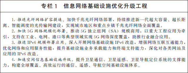 (一)加快建設(shè)信息網(wǎng)絡(luò)基礎(chǔ)設(shè)施。建設(shè)高速泛在、天地一體、云網(wǎng)融合、智能敏捷、綠色低碳、安全可控的智能化綜合性數(shù)字信息基礎(chǔ)設(shè)施。有序推進(jìn)骨干網(wǎng)擴(kuò)容,協(xié)同推進(jìn)千兆光纖網(wǎng)絡(luò)和5G網(wǎng)絡(luò)基礎(chǔ)設(shè)施建設(shè),推動(dòng)5G商用部署和規(guī)模應(yīng)用,前瞻布局第六代移動(dòng)通信(6G)網(wǎng)絡(luò)技術(shù)儲(chǔ)備,加大6G技術(shù)研發(fā)支持力度,積極參與推動(dòng)6G國(guó)際標(biāo)準(zhǔn)化工作。積極穩(wěn)妥推進(jìn)空間信息基礎(chǔ)設(shè)施演進(jìn)升級(jí),加快布局衛(wèi)星通信網(wǎng)絡(luò)等,推動(dòng)衛(wèi)星互聯(lián)網(wǎng)建設(shè)。提高物聯(lián)網(wǎng)在工業(yè)制造、農(nóng)業(yè)生產(chǎn)、公共服務(wù)、應(yīng)急管理等領(lǐng)域的覆蓋水平,增強(qiáng)固移融合、寬窄結(jié)合的物聯(lián)接入能力。