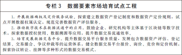 (二)加快數(shù)據(jù)要素市場(chǎng)化流通。加快構(gòu)建數(shù)據(jù)要素市場(chǎng)規(guī)則,培育市場(chǎng)主體、完善治理體系,促進(jìn)數(shù)據(jù)要素市場(chǎng)流通。鼓勵(lì)市場(chǎng)主體探索數(shù)據(jù)資產(chǎn)定價(jià)機(jī)制,推動(dòng)形成數(shù)據(jù)資產(chǎn)目錄,逐步完善數(shù)據(jù)定價(jià)體系。規(guī)范數(shù)據(jù)交易管理,培育規(guī)范的數(shù)據(jù)交易平臺(tái)和市場(chǎng)主體,建立健全數(shù)據(jù)資產(chǎn)評(píng)估、登記結(jié)算、交易撮合、爭(zhēng)議仲裁等市場(chǎng)運(yùn)營(yíng)體系,提升數(shù)據(jù)交易效率。嚴(yán)厲打擊數(shù)據(jù)黑市交易,營(yíng)造安全有序的市場(chǎng)環(huán)境。