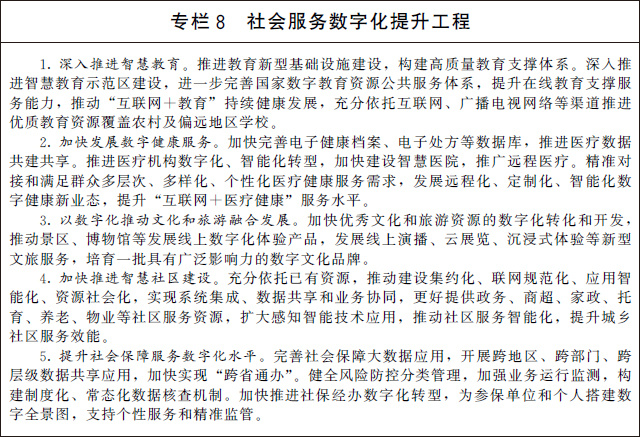 (二)提升社會(huì)服務(wù)數(shù)字化普惠水平。加快推動(dòng)文化教育、醫(yī)療健康、會(huì)展旅游、體育健身等領(lǐng)域公共服務(wù)資源數(shù)字化供給和網(wǎng)絡(luò)化服務(wù),促進(jìn)優(yōu)質(zhì)資源共享復(fù)用。充分運(yùn)用新型數(shù)字技術(shù),強(qiáng)化就業(yè)、養(yǎng)老、兒童福利、托育、家政等民生領(lǐng)域供需對(duì)接,進(jìn)一步優(yōu)化資源配置。發(fā)展智慧廣電網(wǎng)絡(luò),加快推進(jìn)全國(guó)有線電視網(wǎng)絡(luò)整合和升級(jí)改造。深入開展電信普遍服務(wù)試點(diǎn),提升農(nóng)村及偏遠(yuǎn)地區(qū)網(wǎng)絡(luò)覆蓋水平。加強(qiáng)面向革命老區(qū)、民族地區(qū)、邊疆地區(qū)、脫貧地區(qū)的遠(yuǎn)程服務(wù),拓展教育、醫(yī)療、社保、對(duì)口幫扶等服務(wù)內(nèi)容,助力基本公共服務(wù)均等化。加強(qiáng)信息無(wú)障礙建設(shè),提升面向特殊群體的數(shù)字化社會(huì)服務(wù)能力。促進(jìn)社會(huì)服務(wù)和數(shù)字平臺(tái)深度融合,探索多領(lǐng)域跨界合作,推動(dòng)醫(yī)養(yǎng)結(jié)合、文教結(jié)合、體醫(yī)結(jié)合、文旅融合。