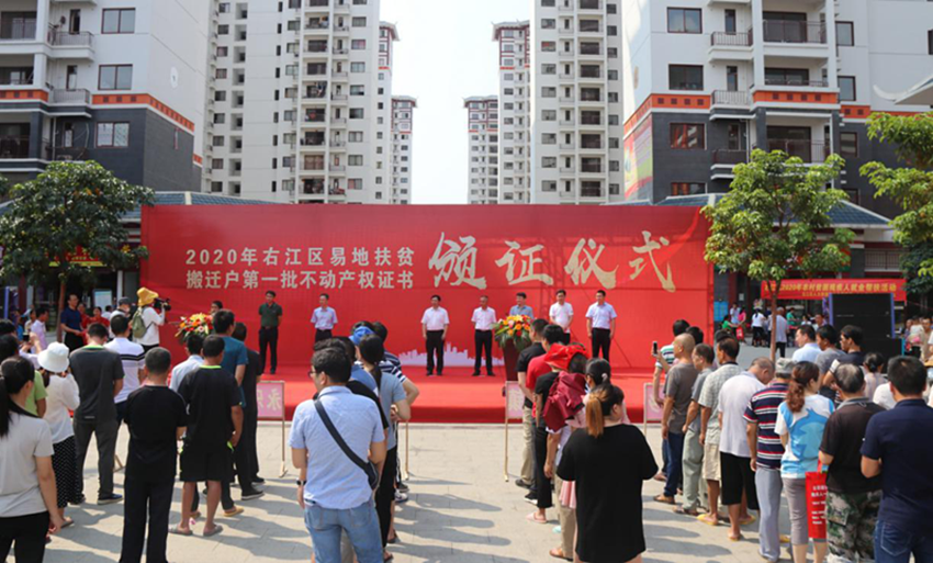 5月16日上午,右江區(qū)“老鄉(xiāng)家園—迎龍易地扶貧搬遷安置小鎮(zhèn)”搬遷戶不動(dòng)產(chǎn)權(quán)證書頒證儀式在安置小鎮(zhèn)舉行,第一批26戶搬遷戶順利拿到了產(chǎn)權(quán)證書。百色市發(fā)改委副主任、市水庫和扶貧易地安置管理局局長(zhǎng)羅加攀,右江區(qū)委常委、區(qū)人民政府副區(qū)長(zhǎng)岑萬興,右江區(qū)委常委、宣傳部部長(zhǎng)、區(qū)人民政府副區(qū)長(zhǎng)王世凡,右江區(qū)委常委、辦公室主任盧靈及右江區(qū)直單位、鄉(xiāng)鎮(zhèn)代表,廣西百色益眾投資有限公司董事長(zhǎng)、總經(jīng)理趙家臣出席儀式。儀式由王世凡主持。